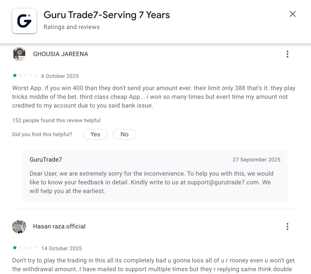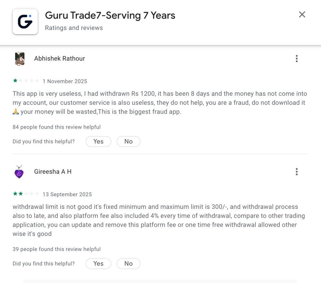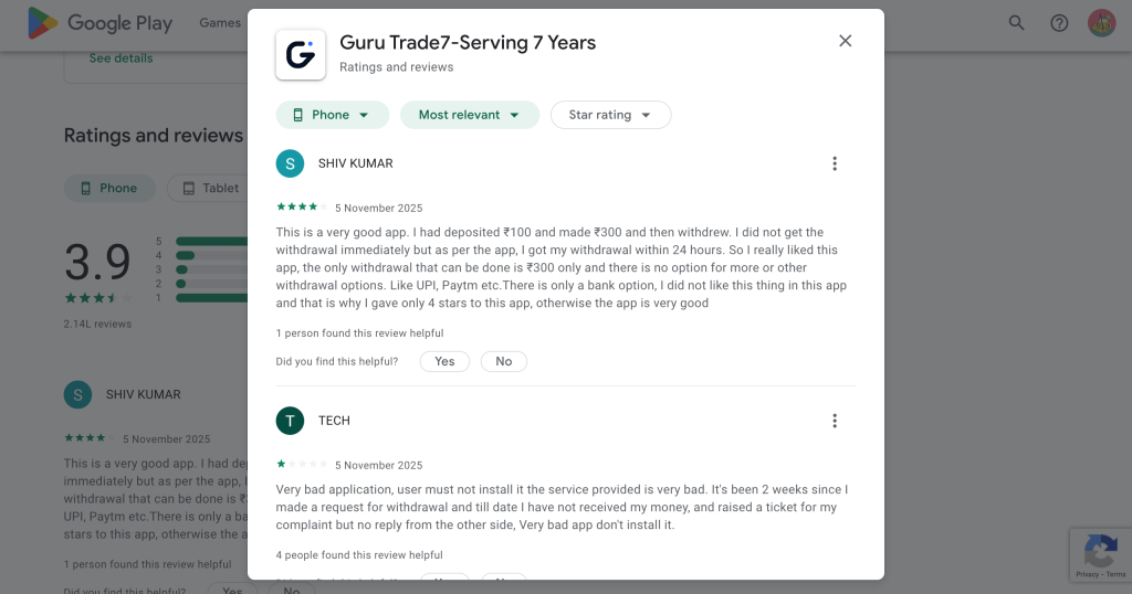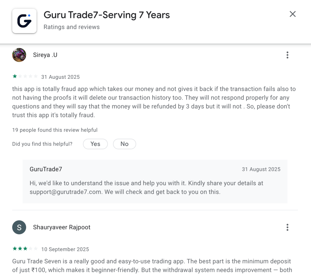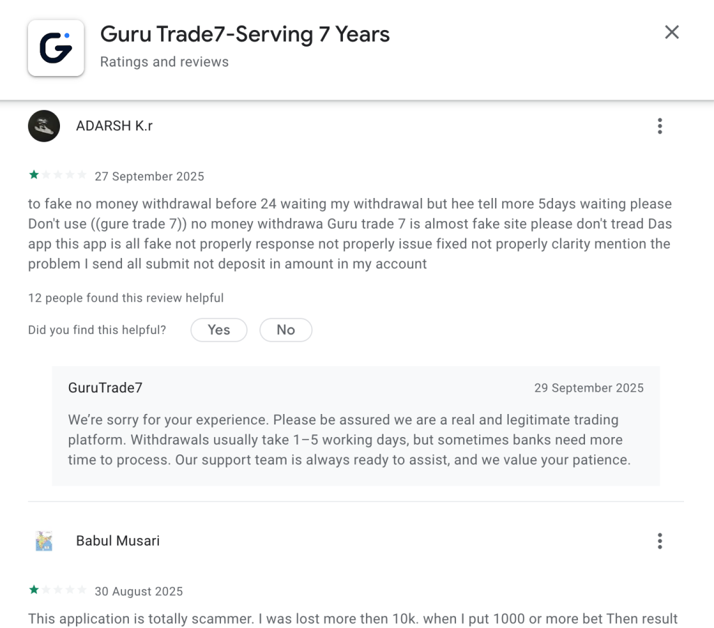 The screenshots shown below have been taken directly from the Google Play Store to provide a genuine overview of Guru Trade 7 App’s user reviews and ratings. These images reflect real user feedback—both positive and negative—helping readers understand the actual experiences of people who have used the app.