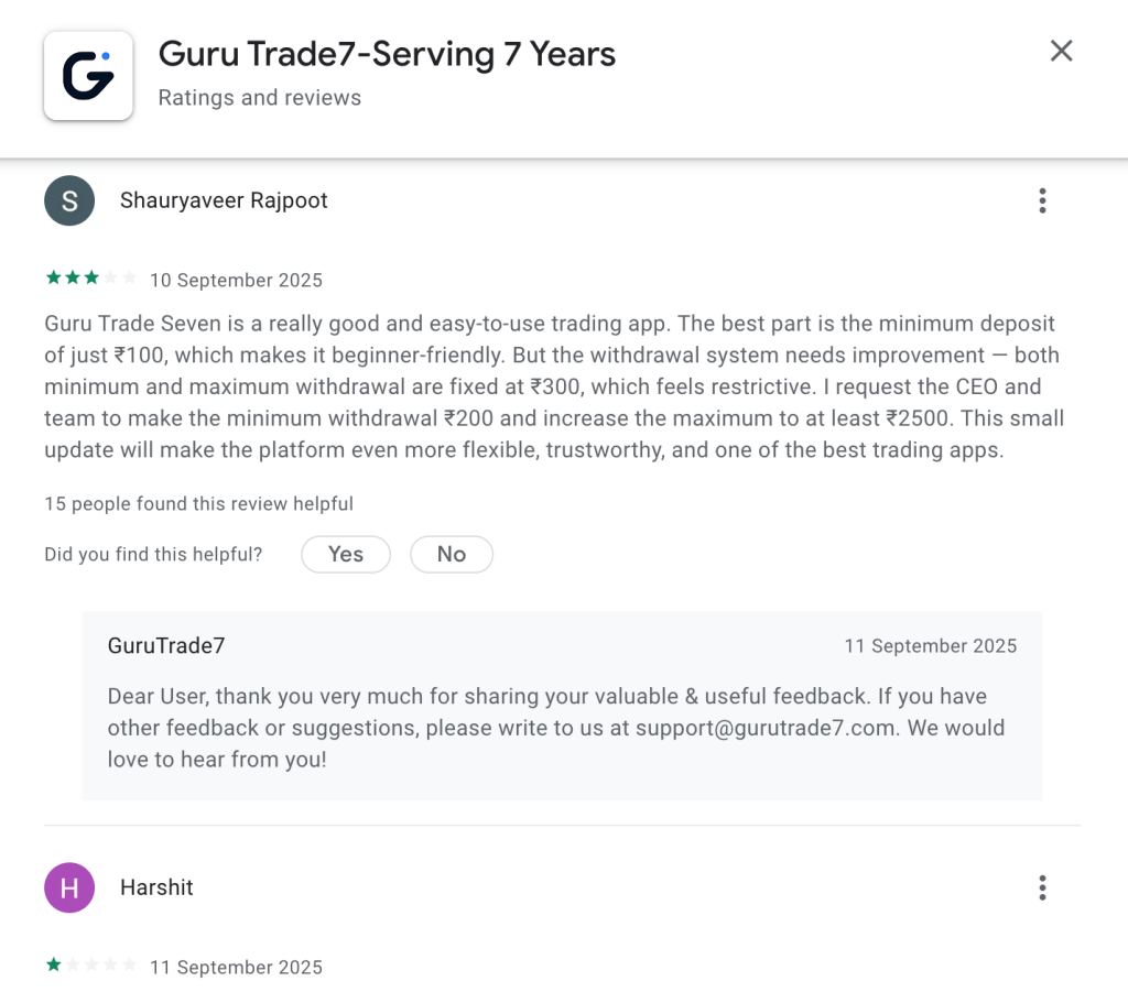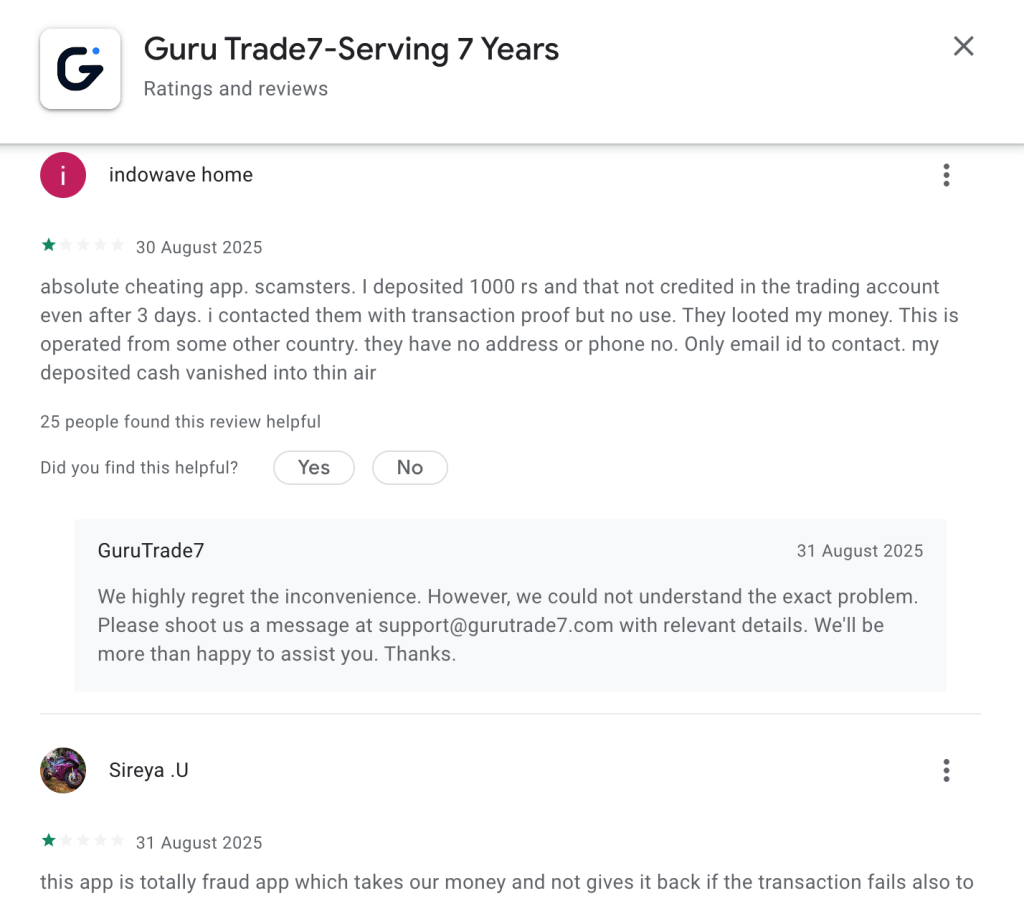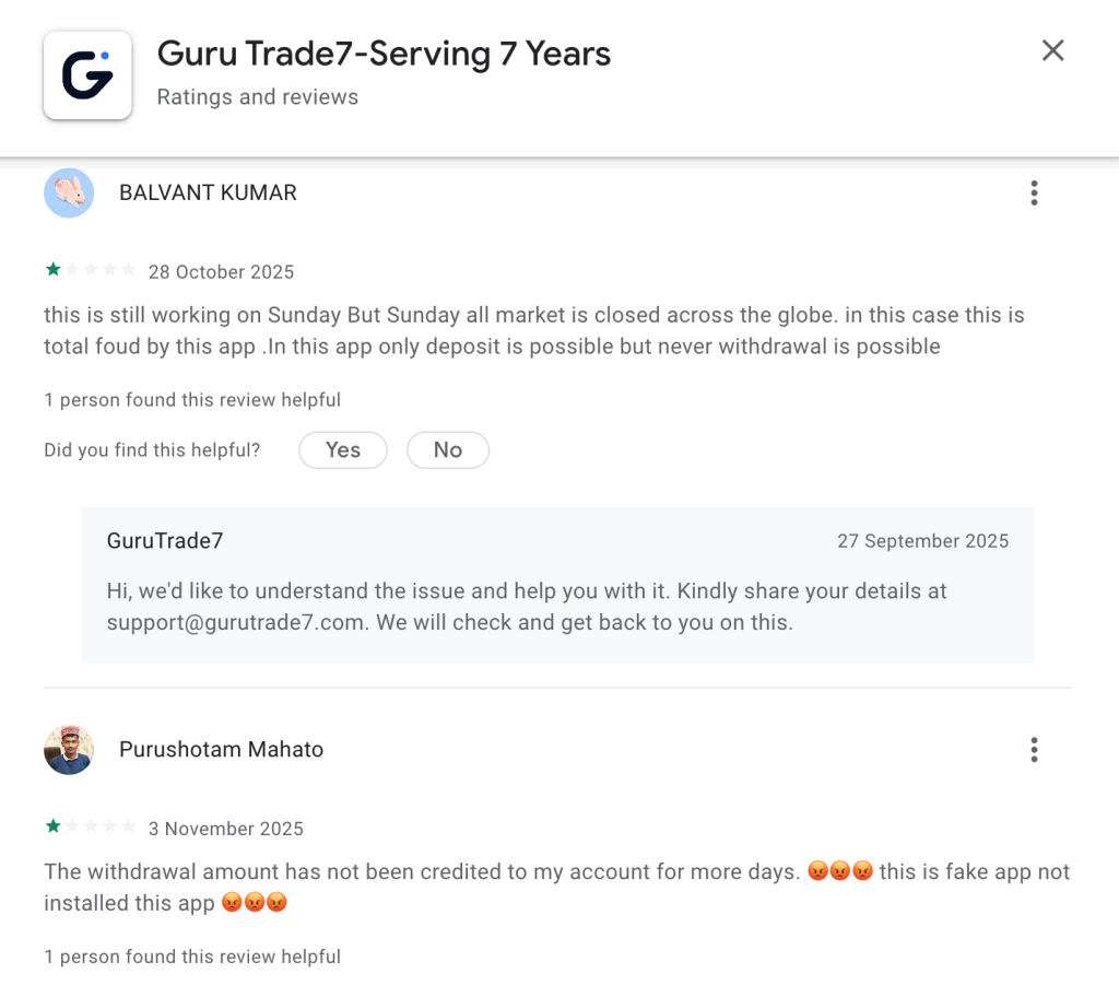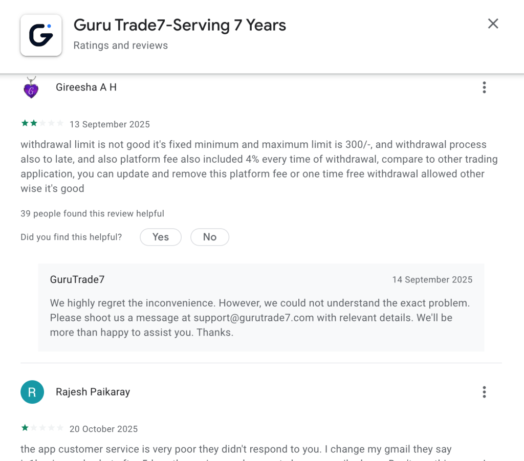 The screenshots shown below have been taken directly from the Google Play Store to provide a genuine overview of Guru Trade 7 App’s user reviews and ratings. These images reflect real user feedback—both positive and negative—helping readers understand the actual experiences of people who have used the app.